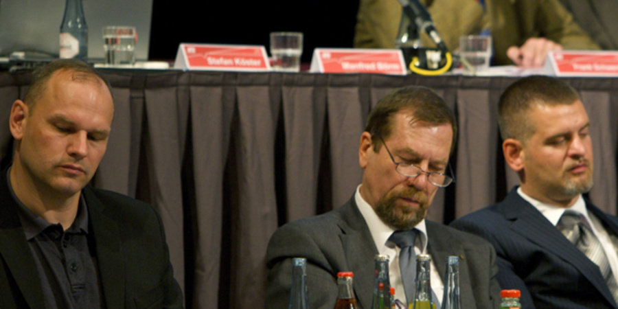 Einige Führungskader der »Freien Kameradschaften« auf dem NPD-Präsidium beim 32. Ordentlichen Bundesparteitag der NPD in Bamberg. Im Bild v.l.n.r.: Thomas Wulff, Jürgen Rieger und Thorsten Heise.
