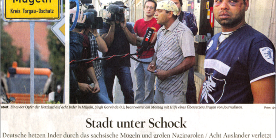 Mügeln vor knapp zwei Jahren: Acht Inder feierten mit beim jährlichen Altstadtfest der sächsischen Kleinstadt. Einigen Mügelnern missfiel das, den Indern wurde gedroht, sie sollten gehen. Dies wollten sie dann auch tun, doch vor dem Festzelt wartete bereits eine dreißigköpfige Gruppe Deutscher, die die Inder mit Pfefferspray, Flaschen, Schlägen und Tritten attackierte. Verletzt gelang den Indern die Flucht in die nahe gelegene Pizzeria des einen Inders. Der Mob folgte, belagerte die Pizzeria und wuchs auf eine Gruppe von 50 Personen heran, begleitet und geschützt von zahlreichen Schaulustigen. In dieser Nacht auf den 19. August 2007 versuchte die Gruppe in die Pizzeria einzudringen: Scheiben gingen zu Bruch, der Lieferwagen wurde demoliert, ein Eisengitter in die Tür geworfen, Parolen wie »Ausländer raus«, »Hier regiert der nationale Widerstand« und »Türkenschweine« gerufen. Die Inder hatten Todesangst. Erst mit dem Eintreffen der Polizei ließ der Mob allmählich von der Pizzeria ab.