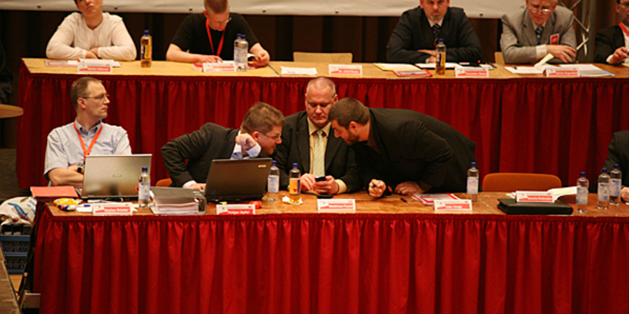 Ein Bild aus besseren Tagen: NPD- und DVU-Funktionäre gemeinsam beim Bundesparteitag der NPD in Berlin 2009 (oben v.l.n.r.) Stella Hähnel, Jürgen Gansel, Thorsten Heise, Ulrich Eigenfeld (unten v.l.n.r.) Stefan Köster, Holger Apfel, Matthias Faust (DVU), Sascha Roßmüller