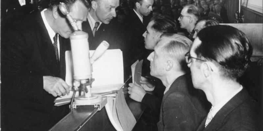 Gerichtsprozeß vor dem 1. Strafsenat des Obersten Gerichts der DDR gegen fünf Agenten der "Kampfgruppe gegen Unmenschlickeit" (KgU) 1955 in Berlin.