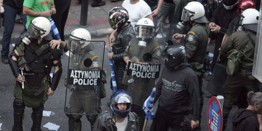 Griechische Verhältnisse: Bewaffnetet Neonazis von Chris Avgi stehen zusammen mit Polizisten AntifaschistInnen gegenüber.