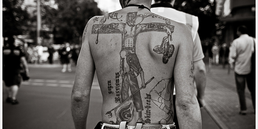Dr. Marten's Sicherheitsschuhe, blankpoliert oder von der Arbeit zerfetzt, abrasierte Haare, Levis-Jeans, donkey jacket, Harrington ... billig, einfach, aus der Not der workingclass Kids geboren und mit viel Stil nach außen getragen. Skinheads, das waren 1968/'69 weiße und schwarze Arbeiterjugendliche die nichts hatten außer ihrem Stolz und ihre proletarische Wut, die sie nicht selten an irgendwelchen middleclass Kids abreagierten. Sie tanzten in ihren Clubs zu der Musik der westindischen Einwanderer, Raggae und Ska. Der einzige Feind war die upperclass und ihre „Lakaien“, die Bobbys.1 Bald wurde es ruhig um die Skinheads. Erst 1976/'77, mit dem aufkommen des Punkrock tauchten sie wieder in größerer Zahl auf, gemeinsam mit den Punks, später ohne sie. Oi entstand. Oi sollte das musikalische Bindeglied der beiden sich ähnelnden Subkulturen sei. Oi wurde aber von den meisten Punks abgelehnt und so zur Skinheadmusik. Oi war der Protest gegen die herrschende „law and order“, Ausdruck der Wut gegen Polizei, Sozialarbeiter und Staat. Die simple Brutalität gegen alles was sie unterdrücken und befehligen wollte, machte sie zum Feindbild einiger (studierter) Linker, denen sie nicht in ihr „Teetrinker- und Diskutierweltbild“ passten.2 Als sich rassistische Überfälle von „Skinheads“ häuften, wurden sie von der Presse als neue SA betitelt. Diese Verallgemeinerung bewirkte, daß viele neonazistische Jugendliche sich dem „Arbeiterstil“ zuwendeten und das ursprüngliche Klassenbewußtsein in ein Rassenbewußtsein umwandelten.