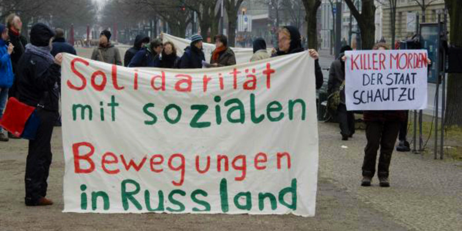 Solidaritätskundgebung für die Sozialen Bewegungen in Russland im Februar 2009 vor der Russischen Botschaft in Berlin