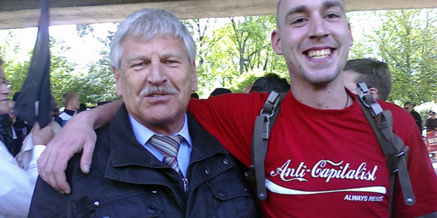 Björn M. posiert zusammen mit Udo Voigt am 1. Mai 2011 in Bremen.