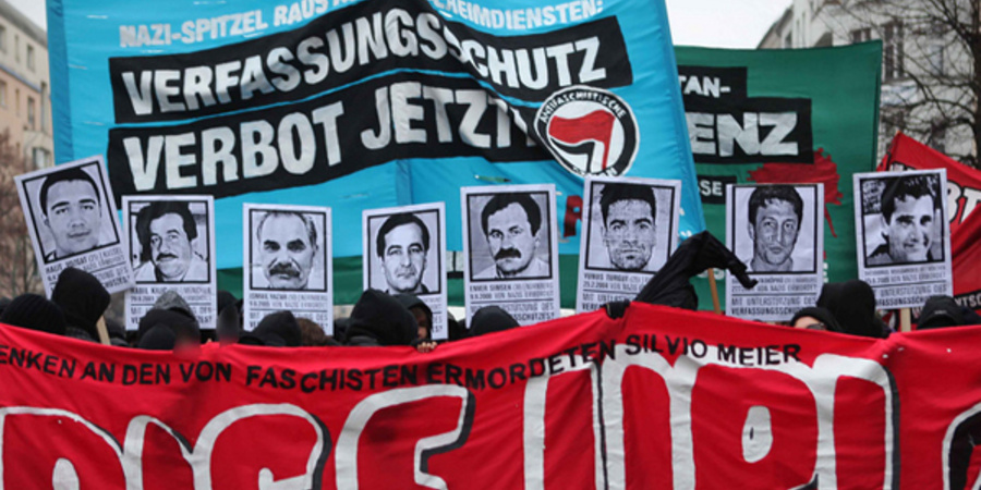 Antifaschistisches Banner für das Verbot des Verfassungsschutzes und gegen Nazi-Spitzel in den Geheimdiensten auf der Silvio-Meier- Demonstration am 19. November 2011 in Berlin. Im Vordergrund die Konterfeis der von der NSU Ermordeten.