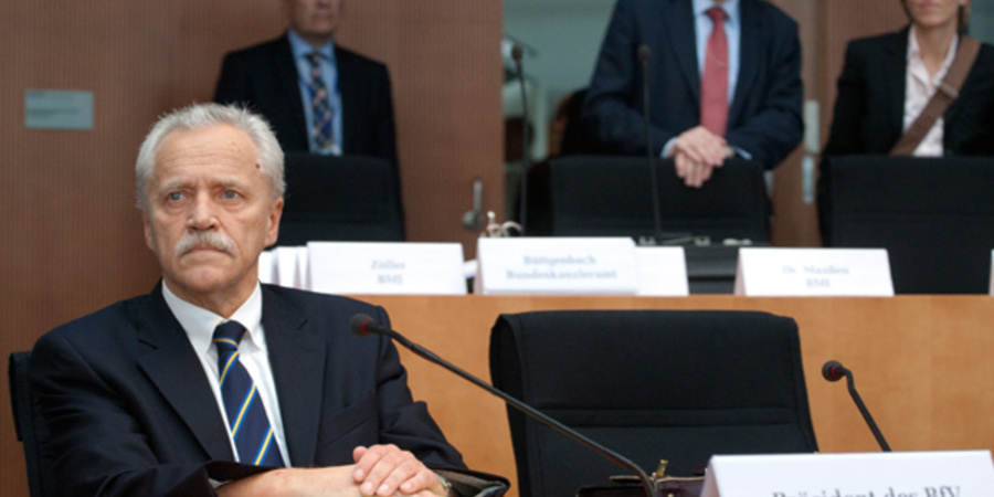 Der ehemalige Chef des Bundesamtes für Verfassungsschutz (BfV), Heinz Fromm am 5. Juli 2012 vor dem NSU-Untersuchungsausschuss des Bundestages. Im Hintergund sein Nachfolger Hans-Georg Maaßen.