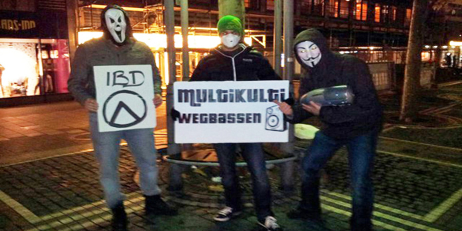 Anwesend waren dagegen deutsche Beobachter, von den »rechtsintellektuellen« Publikationen Blaue Narzisse und Sezession. Vor allem die Erstgenannte beobachtet die »Identitären« mit viel Interesse und Hoffnung. Am 30. Oktober 2012 kam es unterdessen zu dem ersten öffentlichen Auftritt des Phänomens in Deutschland, auch wenn er nur kurz dauerte. Zur Eröffnung der »Interkulturellen Wochen« in der Stadtbibliothek von Frankfurt/Main tauchten drei maskierte junge Individuen auf, die vor den rund 100 Anwesenden zu Technomusik zu tanzen begannen – wodurch sie die Blicke auf sich zogen – und dabei Schilder hochhielten mit der Aufschrift: »Multikulti wegbassen! «