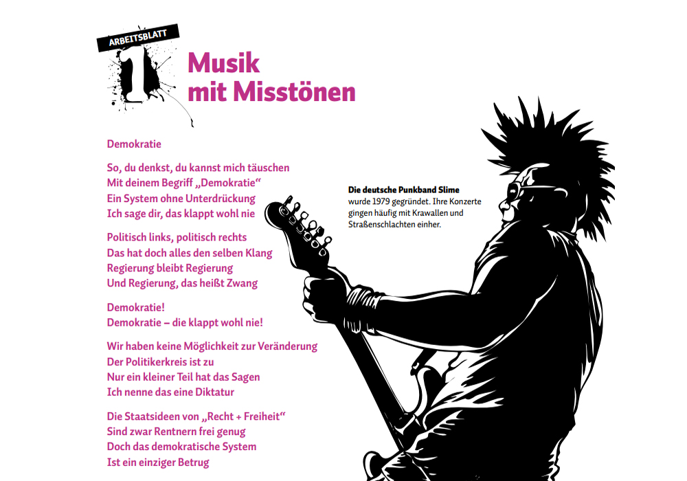 Ein Blick in die bisher laufenden Projekte verstärkt den Eindruck, dass hier weniger wissenschaftliche Kompetenz als vielmehr die Stärkung des Extremismusansatzes für die Bewilligung der Fördergelder ausschlaggebend war. Mit 25.500 Euro gefördert wurde u.a. die Zeitbild Stiftung (ZS) aus München, die mit diversen Arbeitsblättern »Präventionsprojekte gegen Linksextremismus« an Schulen durchführt. Die ZS rechtfertigt ihr Engagement neben dem Verweis auf die »bedrohte Demokratie« auch mit Ergebnissen einer Befragung der Friedrich-Schiller-Universität Jena über linke und rechte Einstellungen bei Jugendlichen. Der Aussage »Durch radikale Umverteilung müssen soziale Unterschiede beseitigt werden« stimmten demnach 32 Prozent der 2.660 befragten Personen zu. Nun ist die Forderung nach Beseitigung sozialer Ungleichheiten nicht unbedingt als Bedrohung der Demokratie zu erkennen, weshalb eine Einordnung dieser Aussage in die Rubrik »Sozialistische Gesellschaftsordnung« vorgenommen wird. Um die »Bedrohung« zu veranschaulichen, müssen wieder einmal brennende Autos herhalten. »Seit dem Jahr 2009 gab es in Berlin zahlreiche Brandanschläge, bei denen bisher hunderte Pkws zerstört wurden. Wer hinter diesen Anschlägen steht, kann die Polizei nur schwer ermitteln. Ein beträchtlicher Teil geht auf linksextremistische Gewalt zurück.« Woher die ZS ihr Wissen über linke Beteiligung hat, wenn doch schon polizeiliche Ermittlungsdefizite genannt werden, bleibt ihr Geheimnis. Mai-Krawalle, G8-Krawalle, Hausbesetzungen und Straßenfeste scheinen genug Anlass zu geben, über die Gefahr von linker Massenmilitanz aufklären zu wollen. Als Begründung dafür steht laut ZS allerdings die Gewalt gegen PolizistInnen im Vordergrund. Rätselhaft bleibt bei aller Bebilderung von gewalttätigen Menschenmassen dann aber diese Erklärung: »Die Täter handeln meist allein, sind in der großen Mehrheit männlich und durchschnittlich unter 25 Jahre alt. Das zweithäufigste Motiv für Angriffe auf Polizeibeamte ist aus Sicht der Beamten Feindschaft gegenüber der Polizei bzw. dem Staat.« Nach Einführung der obligatorischen »Konfrontationsgewalt« dann endlich die didaktischen Empfehlungen für Lehrkräfte. Zehn Arbeitsblätter die sich, nach Vorstellung der ZS, für Projekte in den Fächern Politische Bildung, Politik, Gesellschaft, Gemeinschafts- und Sozialkunde, Deutsch, Religion oder Ethik, Wirtschaft und Kunst eignen. Die Auseinandersetzung mit dem Lied »Demokratie« der Punkband Slime zum Beispiel, ist hier aber nicht für den Musikunterricht vorgesehen, sondern dient als Aufhänger für Diskussionen über Stärken und Schwächen der Demokratie. Um praktisch nachzuvollziehen wie »Linksextremismus« funktioniert, gibt es mit dem Arbeitsblatt 6 die Möglichkeit eines Planspiels. Hier geht es um die Räumung des Hausprojektes »Liebigstraße 14« in Berlin-Friedrichshain. Die Teilnehmenden sollen auf einer Mindmap alle unterschiedlichen Argumente zusammentragen, um über eine konstruktive Diskussion den Dialog aller Beteiligten zu stärken. Dazu können sie in verschiedene Rollen schlüpfen: Anwohner, Hausbesetzer, Cafébesitzer, Bürgermeister, Journalist, Polizei, Eigentümer, Konfliktbetreuer und Gewaltbereiter. Nun laden profitorientierte Hausbesitzer, auf Wahlstimmen angewiesene PolitikerInnen und vermummte, nicht gekennzeichnete PolizistInnen nicht immer zum offenen Dialog ein, aber zum Glück gibt es noch den Konfliktbetreuer: »Ziel muss es sein, einen Kompromiss zu finden. Dazu habe ich einen guten Vorschlag: Mietwohnungen in einem anderen Stadtbezirk.« Führt diese Auswahl an Arbeitsblättern der ZS auf den ersten Blick zu Erstaunen und Grinsen, machen Verweise in der Literaturliste, die sich fast ausschließlich auf Publikationen der Extremismusanhänger Jesse und Backes beziehen, die Motivation deutlich, diesen konstruierten Ansatz zu legitimieren.